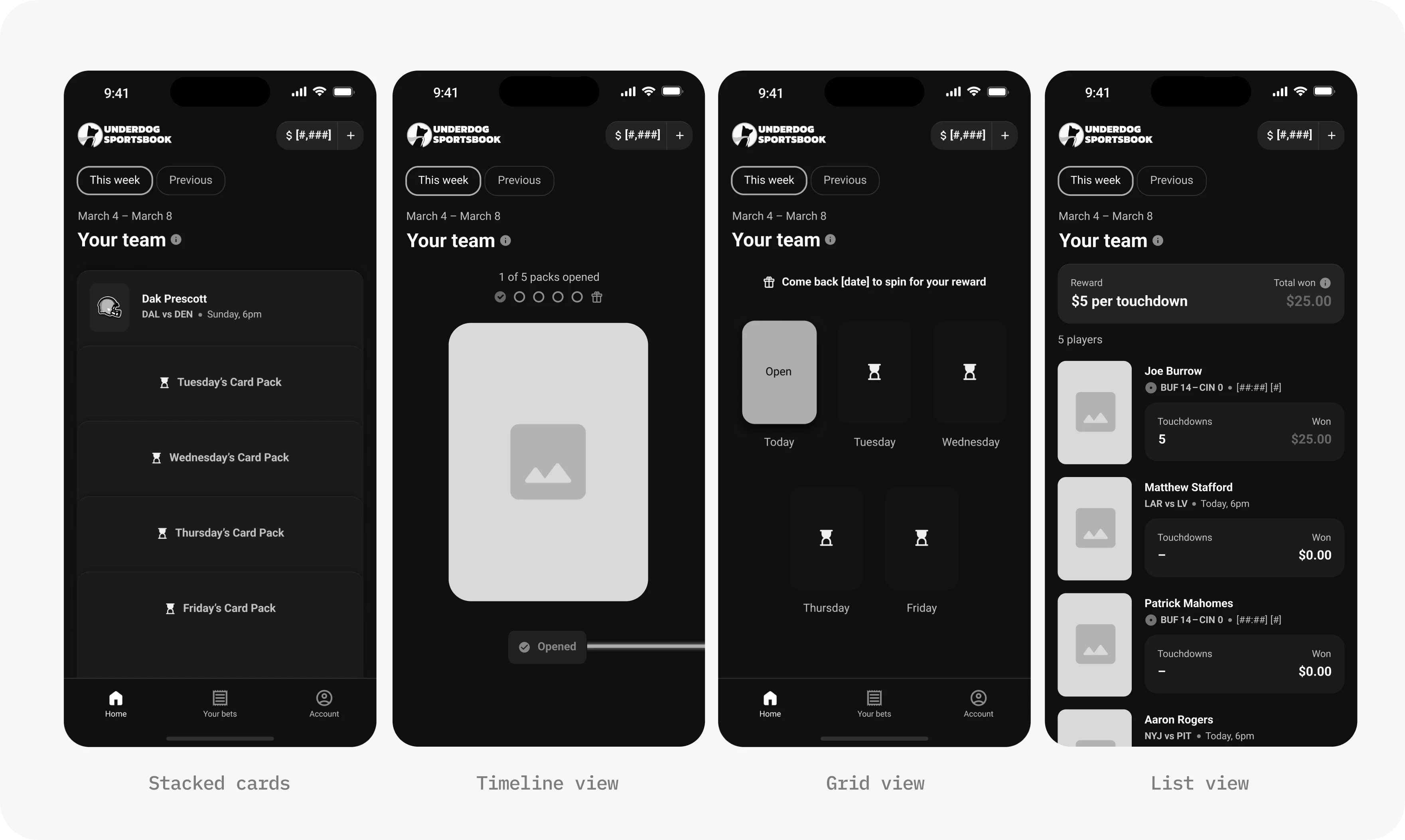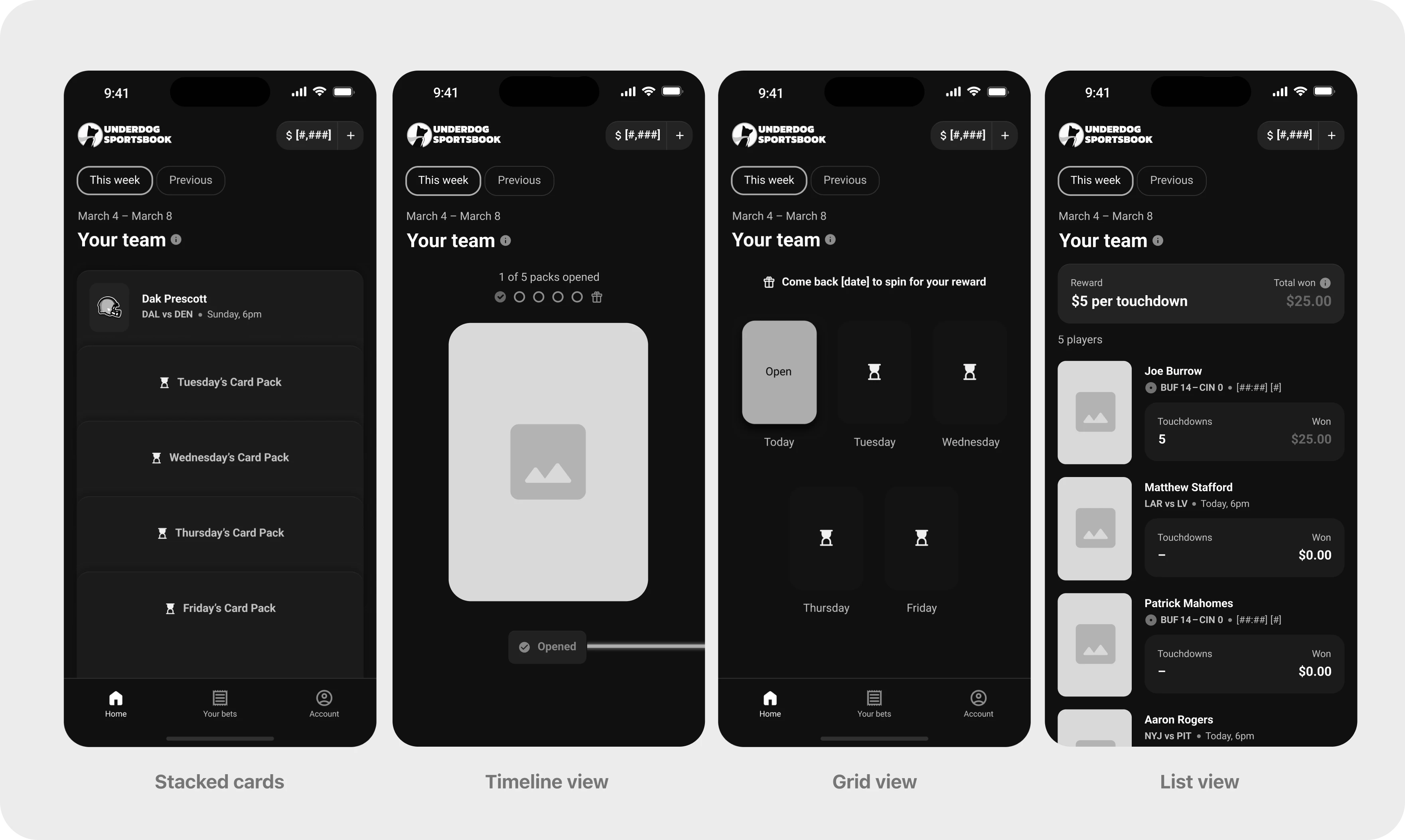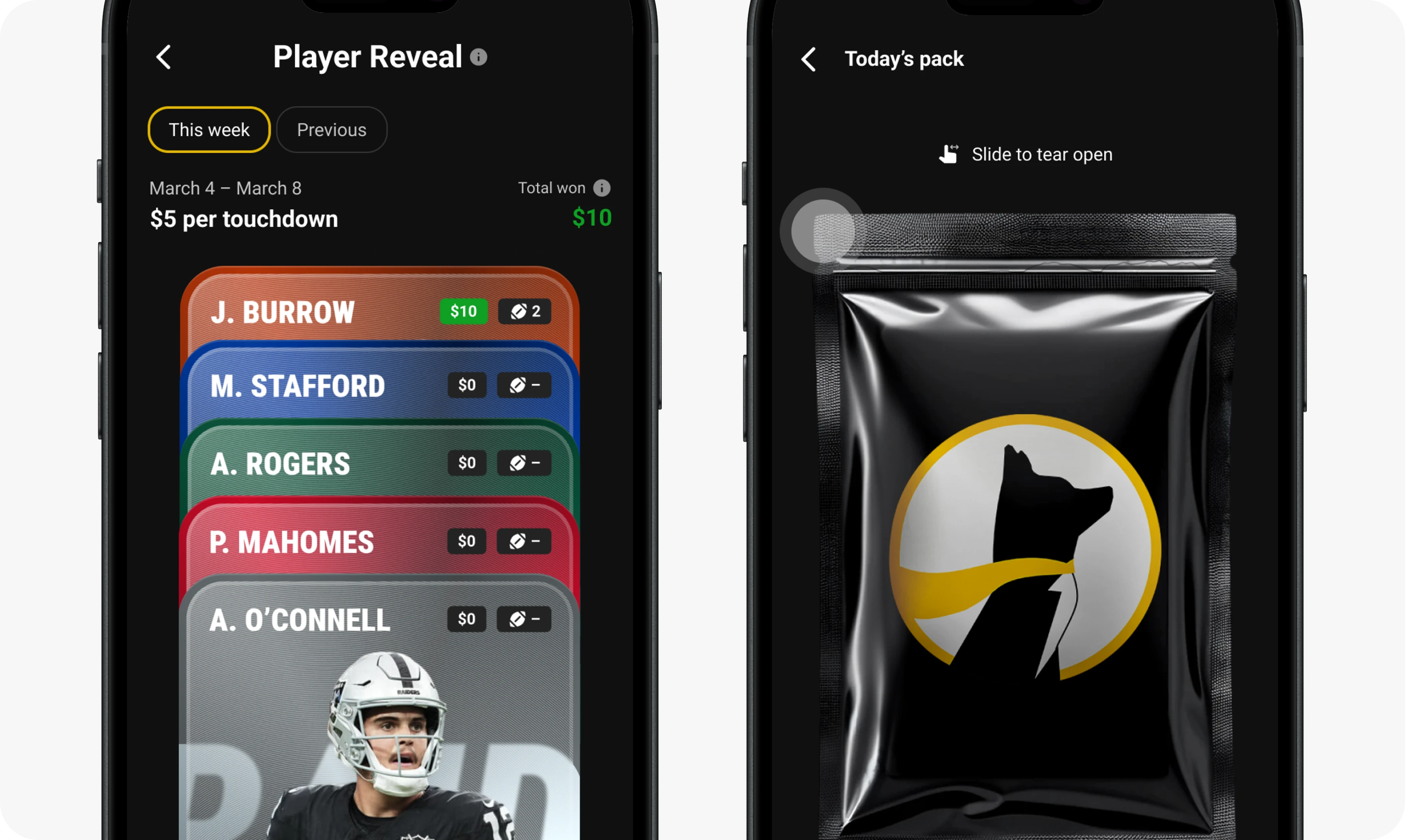 Player Reveal was a daily retention mechanic for Underdog Sportsbook that let customers unlock one player card per day and build a roster over time. On game day, rewards were tied to those players’ real-world performance. The experience was designed to create a reason to return daily between game days, not just when bets were live.